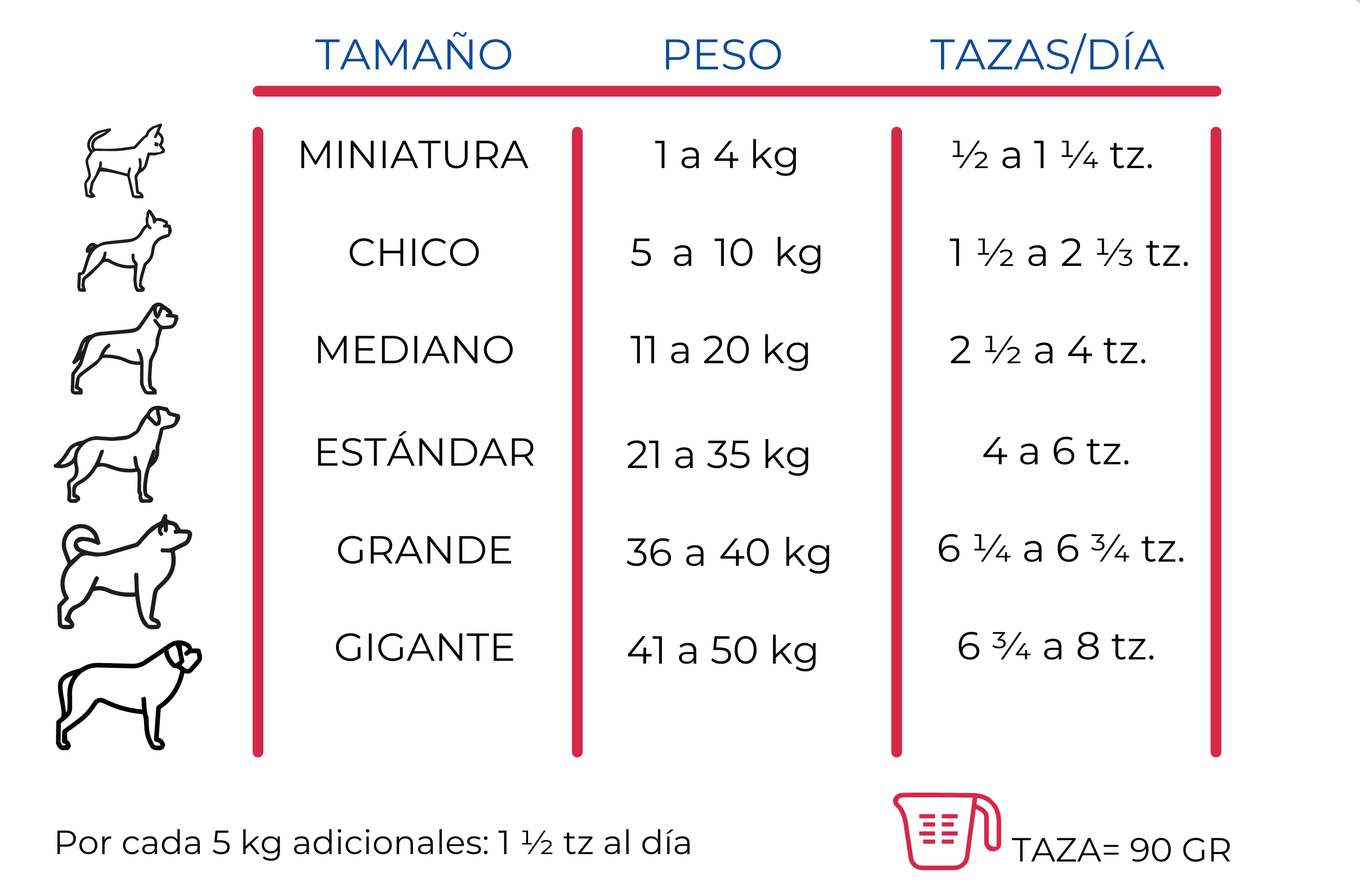 Maíz, fibra natural de trigo, harina de carne y hueso de res, pasta de oleaginosas, harina de pollo, grasa de pollo conservada con BHT y BHA, arroz, papa, pulpa de remolacha, sabor natural de pollo y/o cerdo, aceite de pescado como fuente de ácidos grasos omega 3, sal, celulosa micronizada, chícharo y zanahoria deshidratados, carbonato de calcio, Yucca Schidigera, paredes celulares de Saccharomyces cerevisiae como fuente de prebiótico, cepas de Bacillus licheniformis, Bacillus subtilis, Bacillus amyloliquefaciens, y Bacillus coagulans (≥ 1 X 106 UFC/g) como fuente de probióticos, suplemento de vitamina E y vitamina C como antioxidantes, suplemento de vitamina A, ácido fólico, ácido pantoténico, biotina, niacina, mononitrato de tiamina (vitamina B1), Suplemento de riboflavina (vitamina B2), suplemento de piridoxina (vitamina B6), suplemento de cianocobalamina (vitamina B12), suplemento de vitamina D3 y vitamina K3, zinc orgánico, colina natural, sulfato de cobre, sulfato de manganeso, selenito de sodio, sulfato ferroso, sulfato de zinc, yodato de calcio, cloruro de potasio, ácido orgánico como conservador, tocoferoles y aceite de romero como antioxidante natural, color café caramelo.